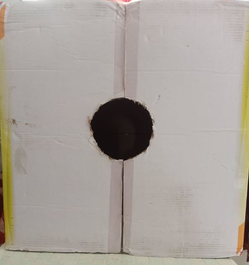 - Cut a small circle in the carton, about 10 cm in diameter towards the bottom of the box.