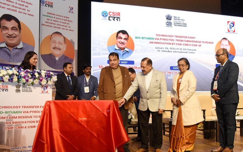 Science & Technology and Earth Sciences (Independent Charge) Minister Dr. Jitendra Singh along with Transport Minister Shri Nitin Gadkari at CSIR’s Technology Transfer Ceremony titled “From Farm Residue to Road: Bio Bitumen via Pyrolysis” in New Delhi on 7 January, 2026.