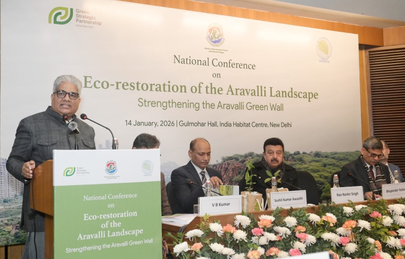 Environment Minister Bhupender Yadav addressing the National Conference on Eco-restoration of the Aravalli Landscape – Strengthening the Aravalli Green Wall in New Delhi on 14 January, 2026.